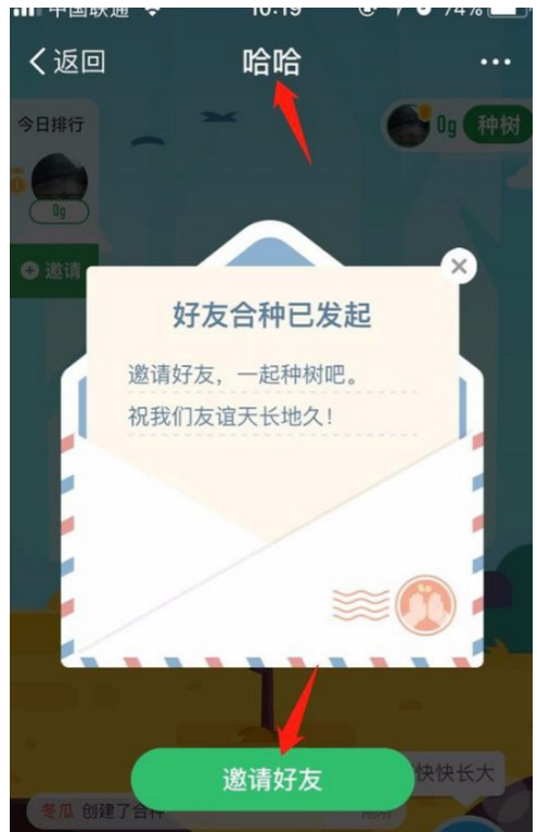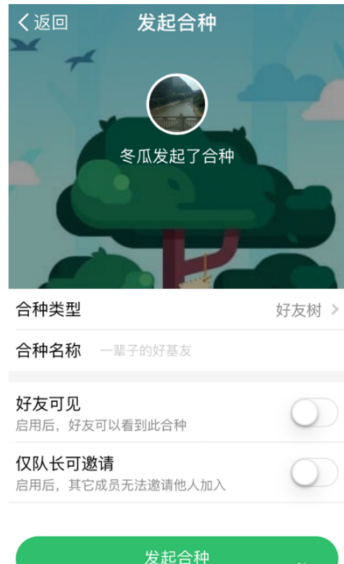 5、在发起合种的界面,我们可以邀请好友,当然也可以在合种发起完成以后再进行邀请,界面顶部的文字,就是显示这棵树的名字。