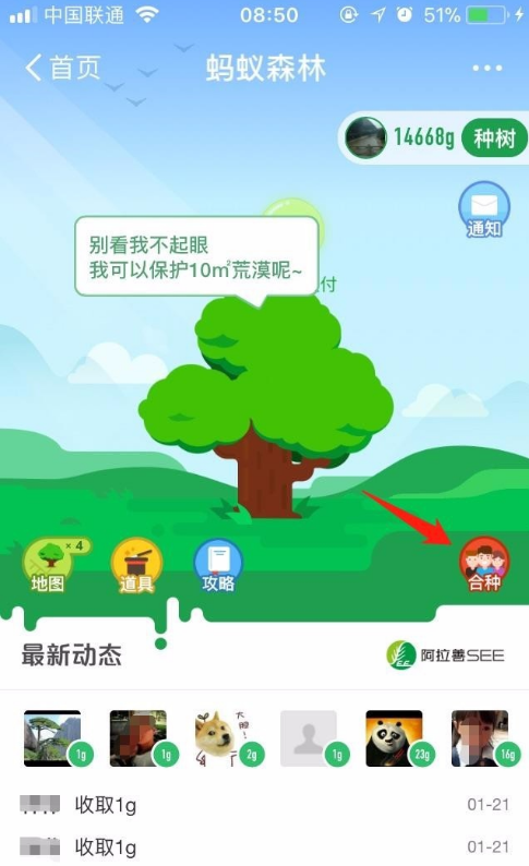 1、打开手机支付宝,进入蚂蚁森林主界面,我们就可以看到新出的合种树功能,点击进入合种树的界面。