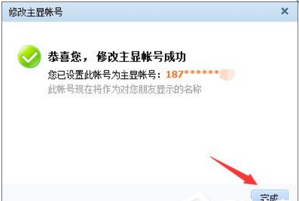 4、此时会提示“修改主显账号成功”,我们点击“完成”。