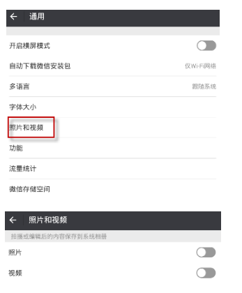 “拍摄”或“照片和视频”,点击后选择“关闭”,以后聊天发送的视频和照片就不会被系统保存啦!
