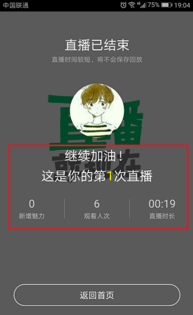 5、直播结束之后,我们可以看到直播时长、观看人数、新增魅力等,如下图所示: