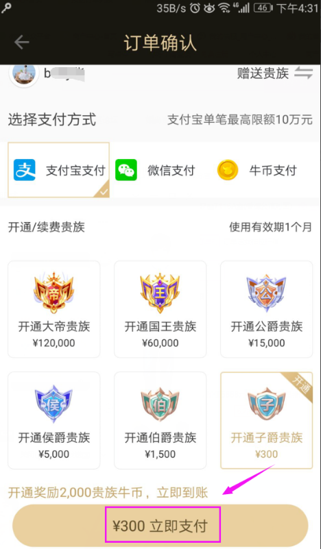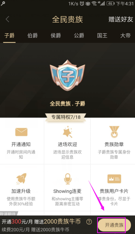 3、我们点击“开通贵族”,如图。