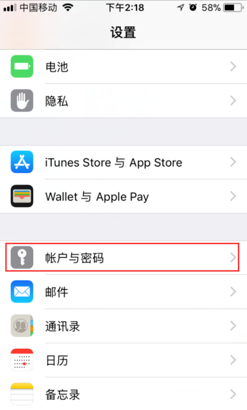 1、打开“设置”图标,进入设置页面,找到“账户名与密码”设置选项,
