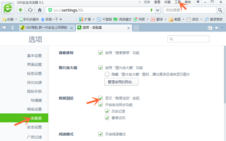 3、如果在浏览器上找不到跨屏浏览的选项,可以按照以下步骤,依次打开工具-选项-实验室,在其中将“显示跨屏浏览按钮”选中即可。