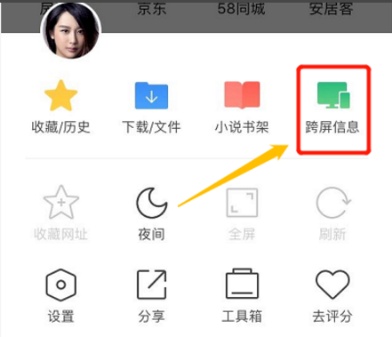 2、接着在手机上打开360浏览器,登录同一个360账户,点击页面下方的横杠图标,接着即可弹出“跨屏信息”选项,点击此项后对着电脑端的二维码扫描、即可同步在线浏览;