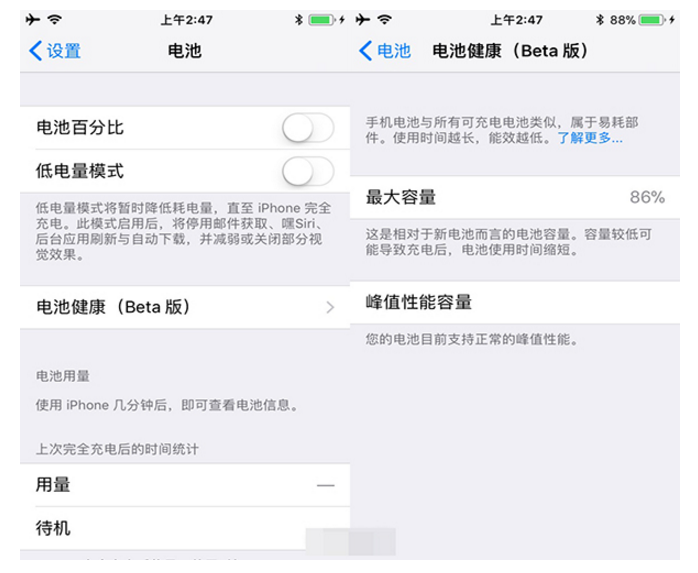 根据苹果官方的描述:对于 iPhone 6 和之后的机型,iOS 11.3 增加了几项新功能,可以显示电池健康状况,并在需要时建议更换电池。这些功能可以在“设置”>“电池”>“电池健康(Beta 版)”中查看。