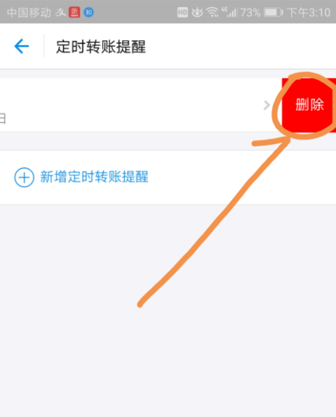 9、如果想删除房租这个定时转账提醒,可以向左侧滑动屏幕,点按出现的删除字样。