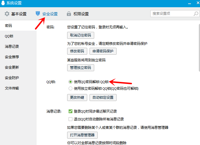 4、进入系统设置页面,我们选择“安全设置”,在“安全设置”下方的设置项中,我们能够看到“使用QQ密码解锁QQ锁”,点击选择该设置项;
