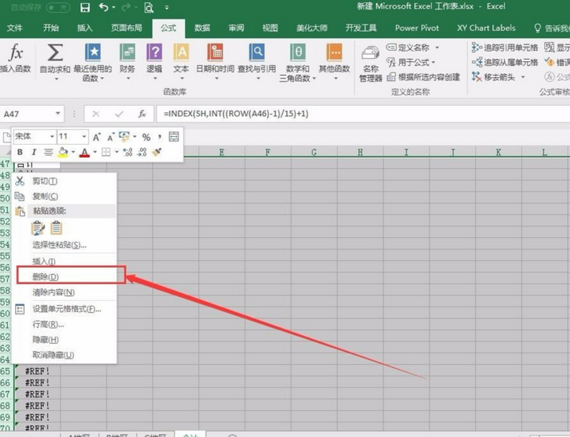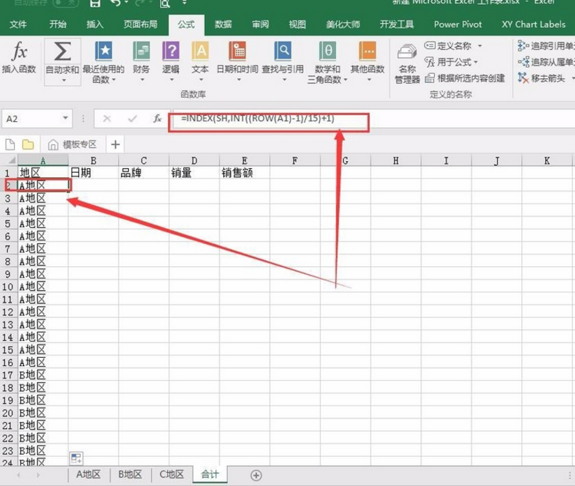 4、在A2单元格输入公式=INDEX(SH,INT((ROW(A1)-1)/15)+1)并下拉填充。尽量多填充一些单元格。