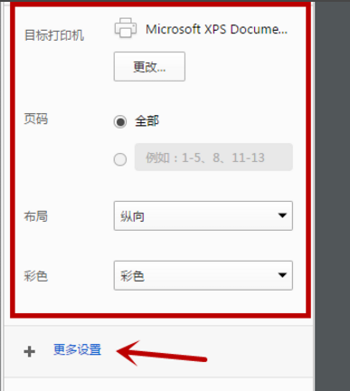 4、我们进入界面,在左侧选择好打印机,并设置打印的页码、布局、色彩,再点击更多设置选项,如图所示。