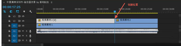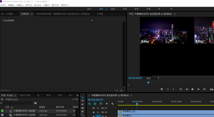 本案例选择了两段长度为30秒的视频,视频分别在V1轨道和V2轨道。