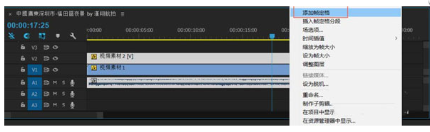 【添加帧定格】用来对播放中的素材突然定格;右击需要静止的轨道视频(本例为V2轨道)在弹出菜单中选择【添加帧定格】,这样位置就被切割,后面的位置就变成了冻结帧。