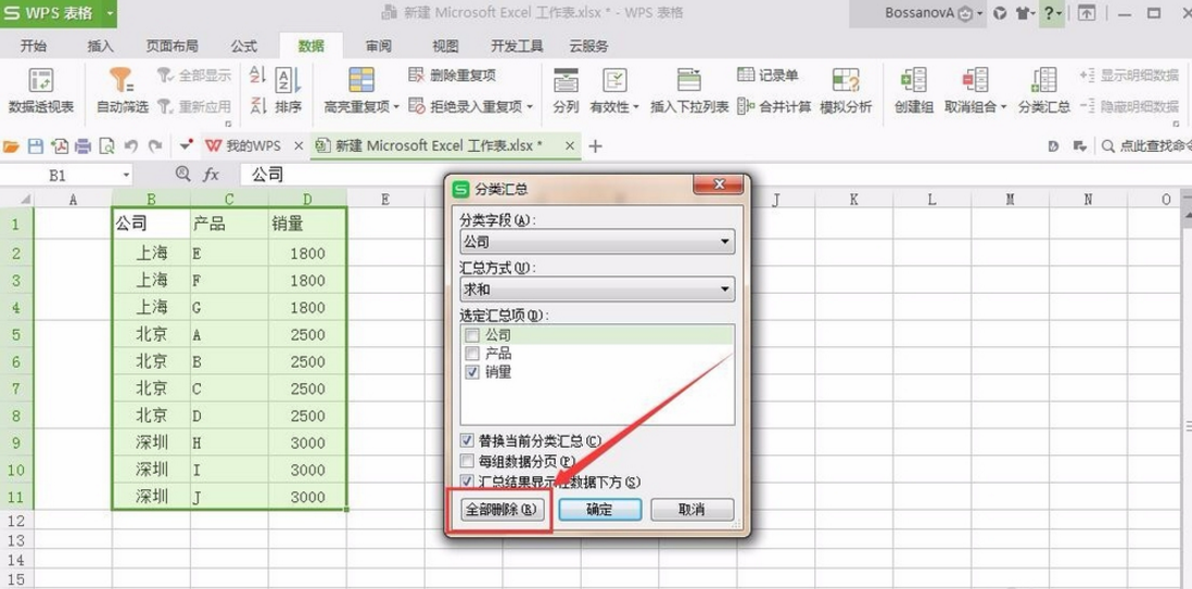 10、再次在菜单栏中点击“数据”、“分类汇总”,在最下方点击“全部删除”。