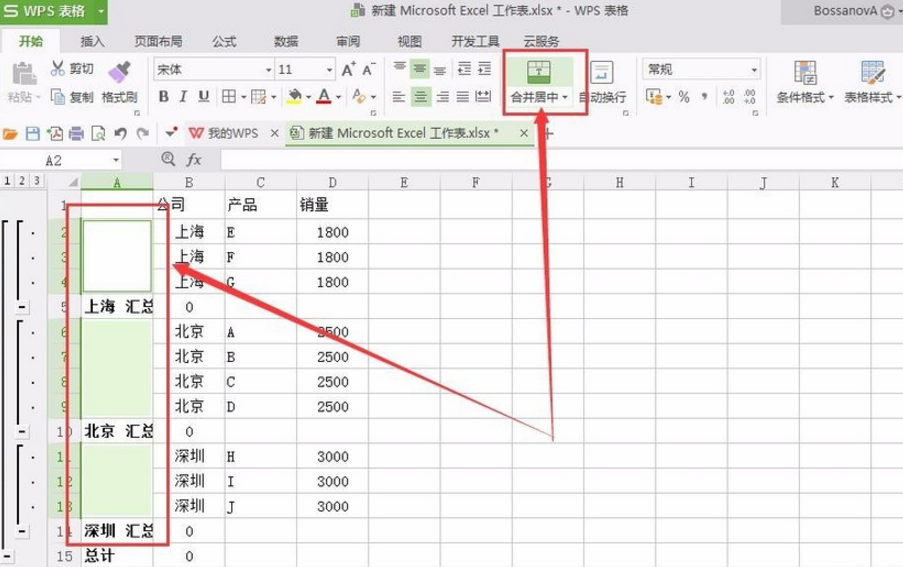 9、对选中区域进行合并居中操作。
