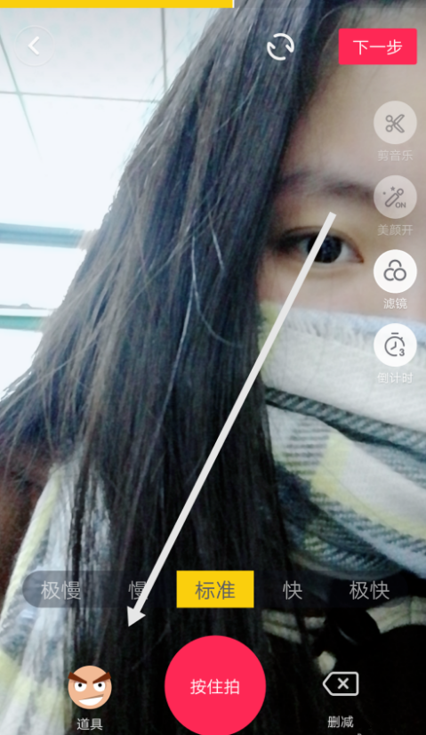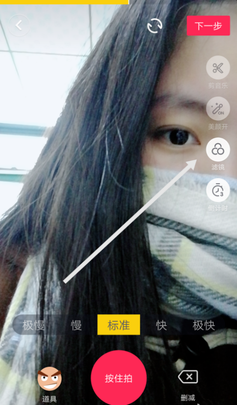 3、录视频期间我们可以选择一些滤镜、美颜等的工具。滤镜可以将你的整个小视频都有滤镜,美颜可以给人物美颜。