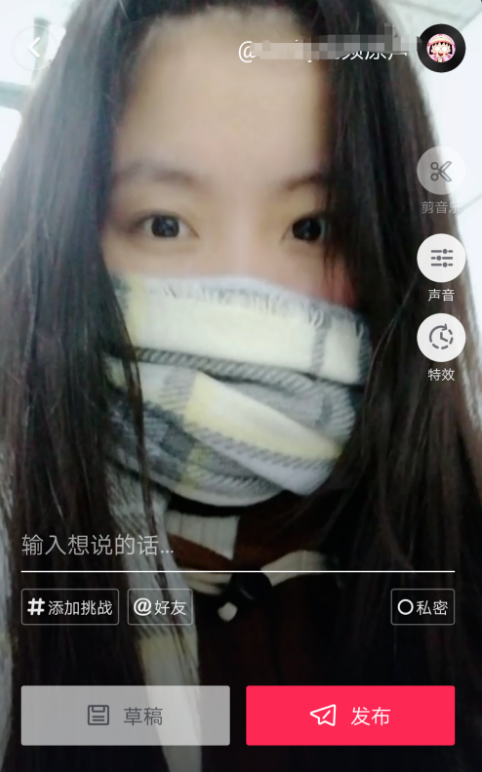 6、最后可以选择声音。可以编辑影像原声和插入声音的音量大小,记得保存,然后输入想说的话点击发布。
