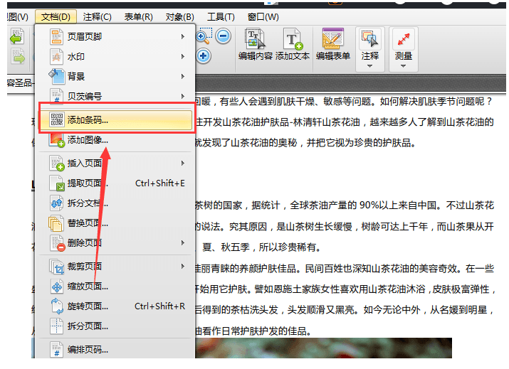 2、打开PDF文件,如果想要在PDF文件里添加条形码,那么需要界面里的“文档”选项,接着点击里面的“添加条码”功能,进行条码添加操作。