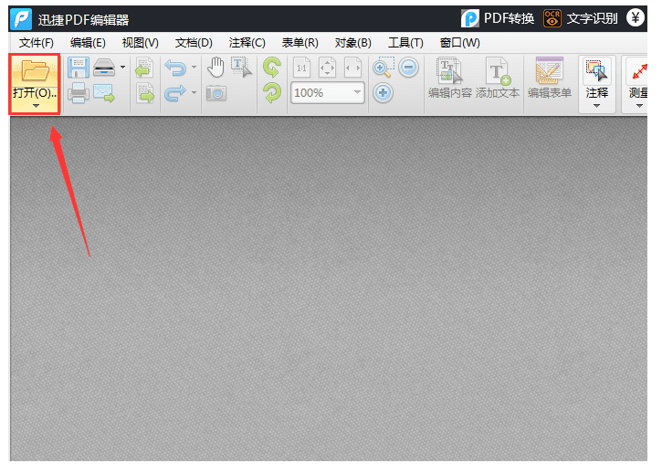 1、运行迅捷PDF编辑器,点击软件界面的“打开”按钮,将需要进行编辑的PDF文件打开。