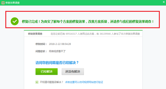 3、我们可以看到下方出现了网络视频看不了的修复方案,先点击网络视频看不了的图标,进去查看造成的原因,如下图所示: