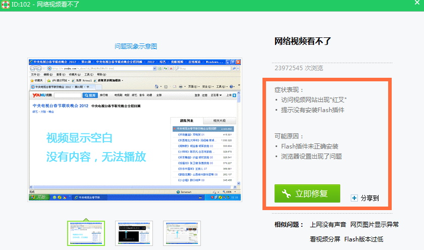 4、进去之后,我们可以看到造成的原因可能是flash插件没有正确安装或者浏览器设置出现了问题,点击“立即修复”按钮,如下图所示: