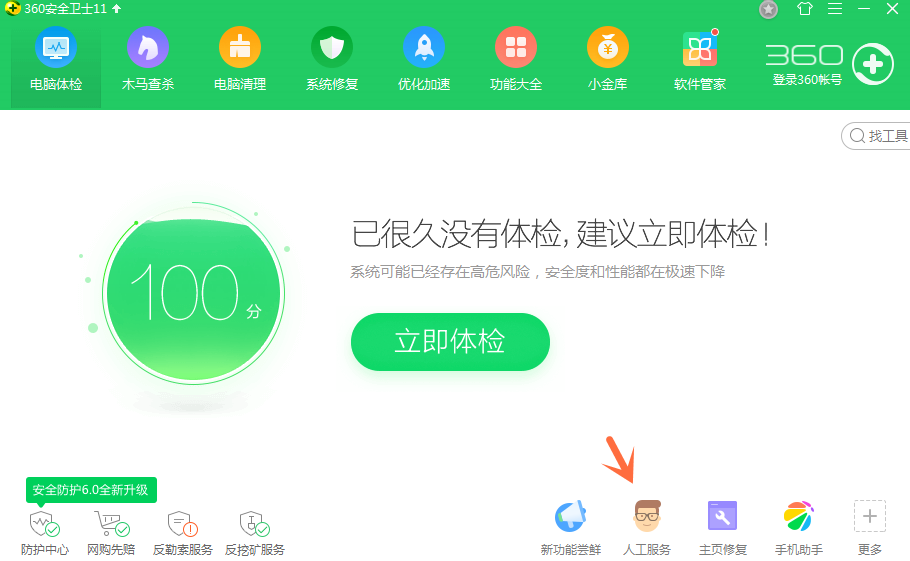 1、在电脑上打开360安全卫士,点击“人工服务”,如下图所示: