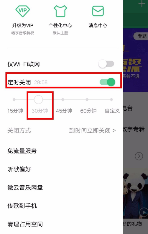 6、关闭方式也可以自由选择,这里提供了两种关闭方式,一是到时间直接关闭,二是听完正在播放的歌曲在关闭,大家可以根据自己的情况设置。