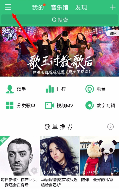 1、在手机中打开QQ音乐,在首页点击左上角的三个横杠,如图。
