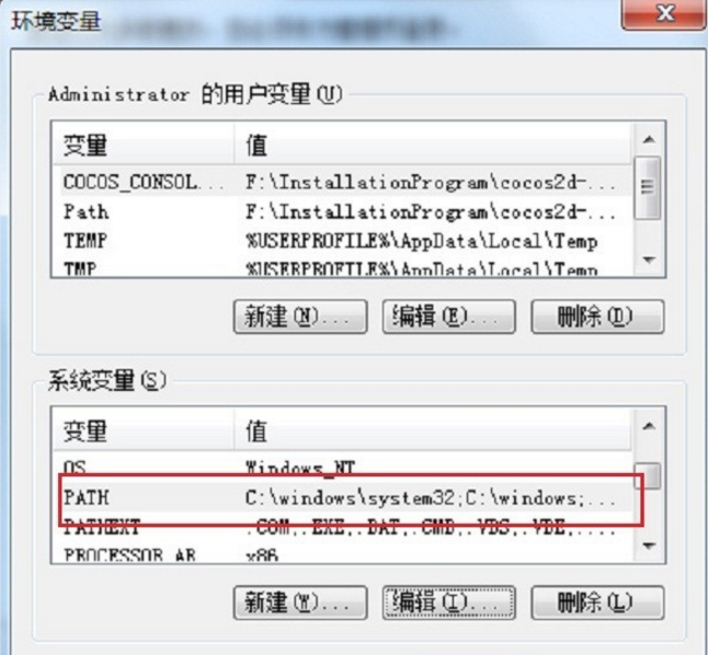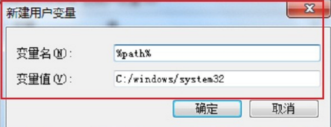 4、在用户变量点击新建,用户名\"%path%”,变量值“C:/windows/system32”,如下图所示: