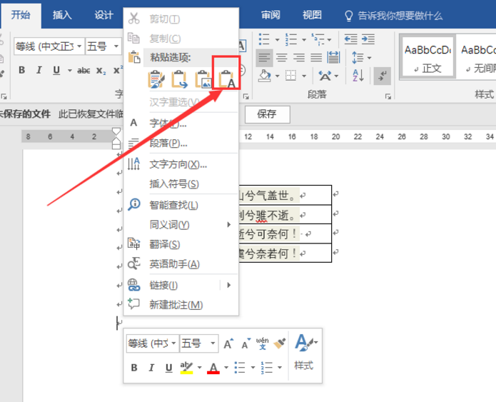 1、打开Word文档,选择第一行的内容右键点击复制,在新的区域点击鼠标右键粘贴;