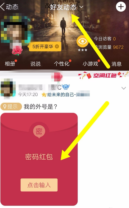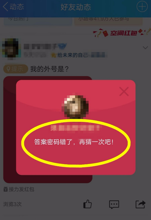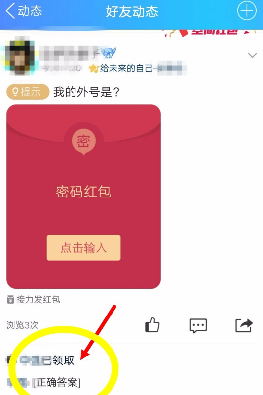 5、我们可以看到红包已经出现在空间动态里,点击红包上面的输入答案即可开始回答提问。