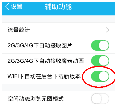 4、点击辅助功能以后进入到辅助功能窗口,在窗口中将在wifi下自动在后台下载新版本后面的开关关闭,这样就不会在自动更新了,如图所示: