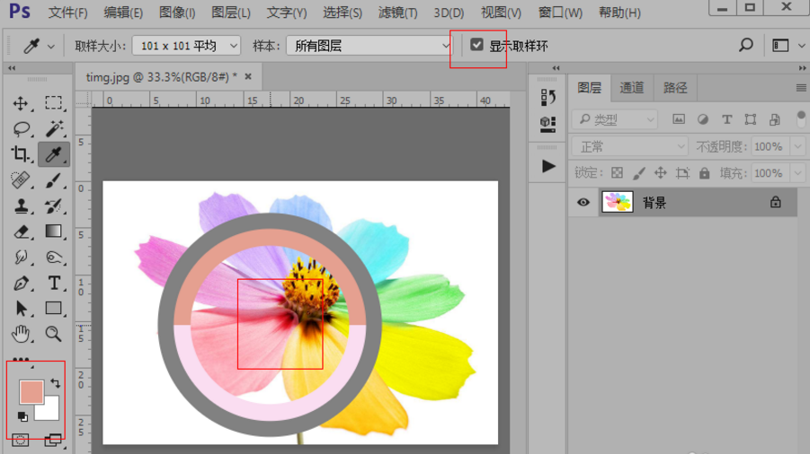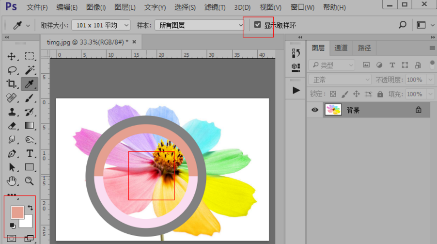 7、显示取样环选择之后,我们在画布上鼠标左键点击选取取样的时候,就会出现如图所示的圆环,不选择则不出现。