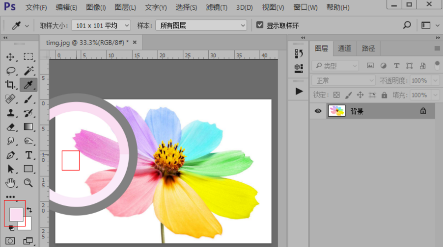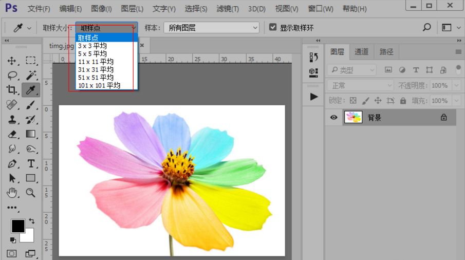 3、我们先看一下吸管工具的属性栏,有取样大小、样本和显示取样环,我们先介绍一下取样大小。