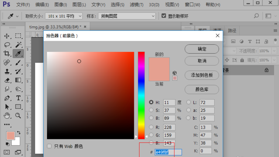 8、吸管吸取的颜色都会在前景色显示,我们点击前景色就可以看到具体的颜色色号。