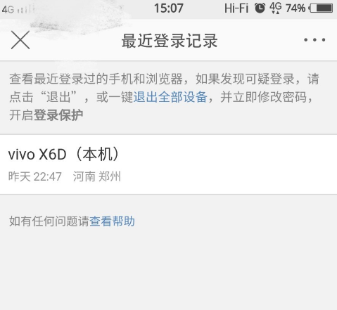 4、我们可以看到最近登陆记录有2条,点击进入最近登陆记录,如果有很多登陆记录,点击上方的退出全部设备;
