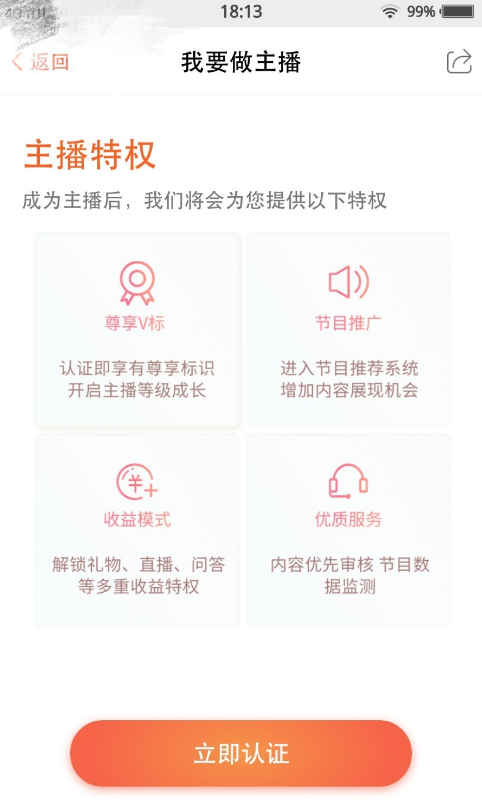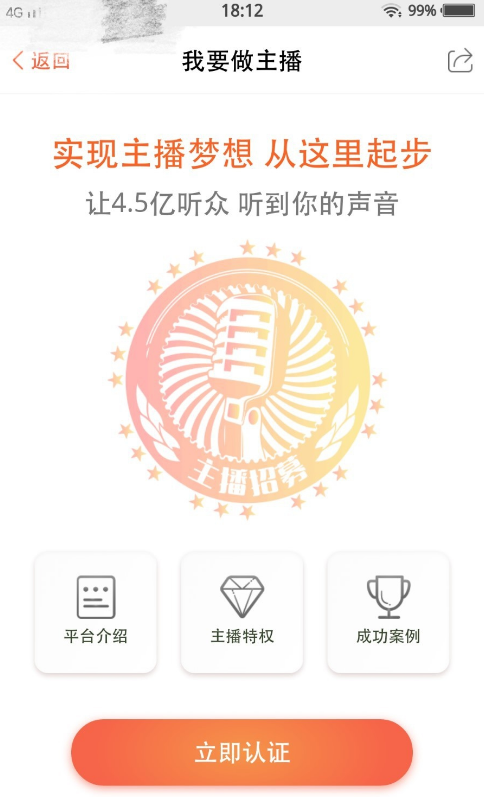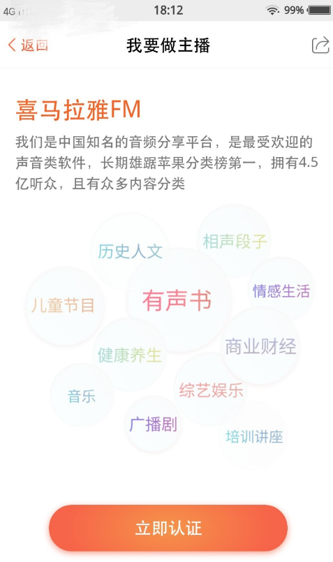 4、然后可以选择向下滑动(喜马拉雅FM关于主播的各种介绍),或者直接点击立即认证;