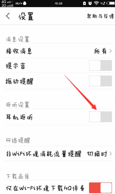 3、进入设置页面,找到“耳机返听”选项并打开,如图。