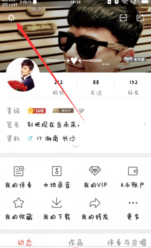 2、来到个人中心,我们打开设置选项,在全民K歌个人中心界面上的左上角有个齿轮标识,打开即可。