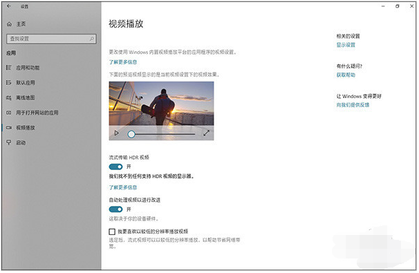 播放的视频太亮太暗怎么办?很简单,点击Win10“设置”→“应用”→“视频播放”,打开“自动处理视频以进行改进”就可以了。这项功能依赖于某些特定硬件(如显卡、显示器),只要你的硬件支持,开启开关后,Win10就会自动对目标视频启用HDR特效,能够明显提升暗部区域的细节质感。