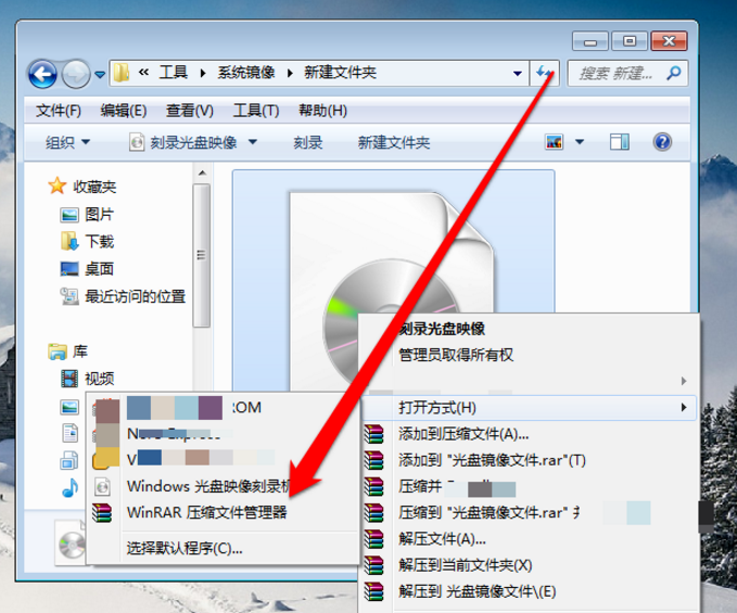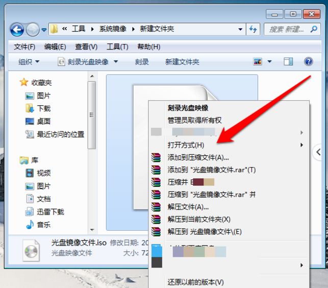 3、选中光盘镜像文件后,使用鼠标右键点击弹出菜单选择打开方式。