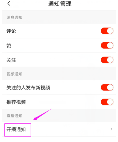3、来到了小视频设置界面,我们在这里点击下开播通知,如图所示。