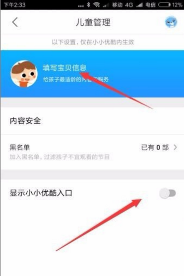 2、这时就会打开儿童管理的主界面,点击打开“显示小小优酷入口”的开关,接着点击上面的“填写宝贝信息”标签,