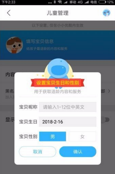 3、接着在弹出窗口中输入宝贝的生日和性别,以方便推荐适合的视频。