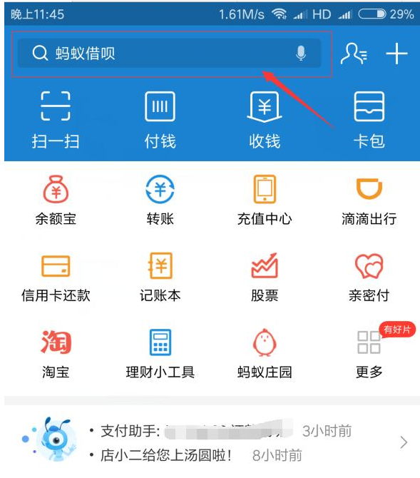 1、打开支付宝首页,在搜索框中搜索,不要在功能区中寻找,哪里如果没有使用过,是难以找到的。