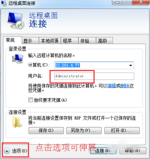 5、点击【选项】可伸展,填写远程电脑的账号,还可以保存远程快捷方式到桌面上,
