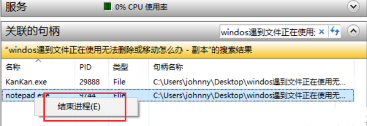 7、通过搜索关键字,我们发现这个文件夹里面有两个文件处于被打开的状态,导致我们无法关闭,如下图,