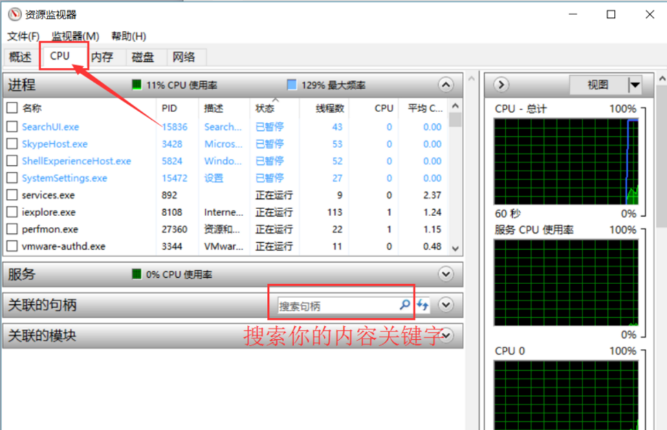 6、在资源监测器页面,点击第二个标签【CPU】,在下面我们可以看到关联句柄,