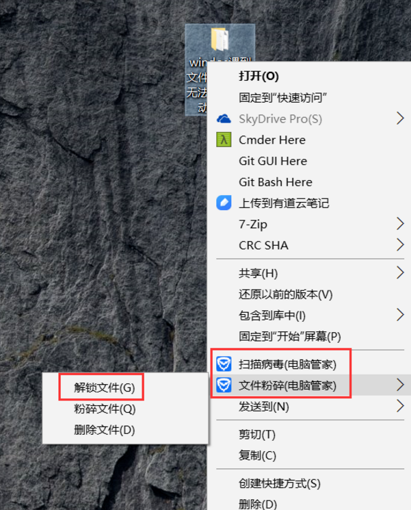 2、如果你的电脑中有安装电脑管家,右键它,之后有文件粉碎的选项,里面有解锁文件,点击就可以解锁掉文件,然后我们在执行删除或者移动操作,假如是删除操作,我们也可以直接执行粉碎文件或者删除文件选项,