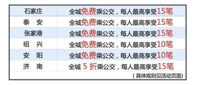 截止到3月底,石家庄、绍兴、泰安、安阳、张家港刷支付宝可享受全城免费乘公交,济南用户可以享受全城五折乘车优惠。乘车前记得先去支付宝里领取电子公交卡,领取方法:支付宝-付钱码-底部“乘车码”。