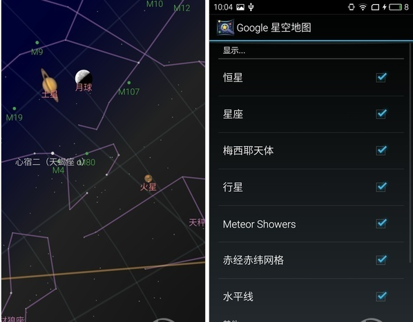 Google Sky Map(谷歌星空)是Google推出的一款星空观测应用软件,它如同一个微型的天文望远镜,带你仰望星空,探寻宇宙的神秘之处。目前Google Sky Map(谷歌星空)可查看各种天体,包括星体、星座、星系、行星和月球,允许用户自由设定显示哪些天体。Google Sky Map 完全依赖手机内建的全球卫星定位系统(GPS)及加速器,精确地利用你的所在位置,包括你所面对的方向、手机倾向何方等等,就可向你显示你当前所在位置的星空图,而且星空图会跟着你的方向移动。